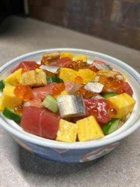 天然本鮪赤身漬け、青魚酢〆、白身昆布〆、山葵の茎酢漬け、お茶など静岡県産の鮮魚や食材を贅沢に使用したバラちらしずし