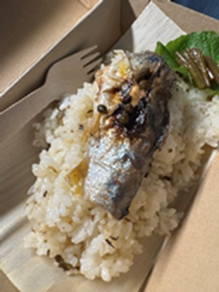 静岡産こしひかりと餅米に「発酵ほろに®︎モロッコ風味」を混ぜたおこわ、梅ヶ島で採れた山椒で味付けされた梅ヶ島育ちのアマゴ(天魚)、わさびの茎の醤油漬け
